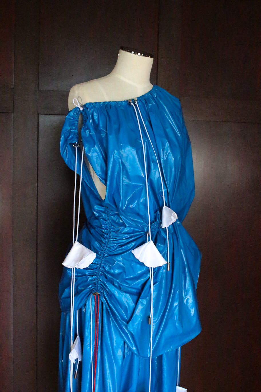 Muguet Top is attached with white and red elastics with details of white slower petal ends to be scrunched to shape. The Blue colour is inspired by the colour of lily ponds in the renaissance paintings.